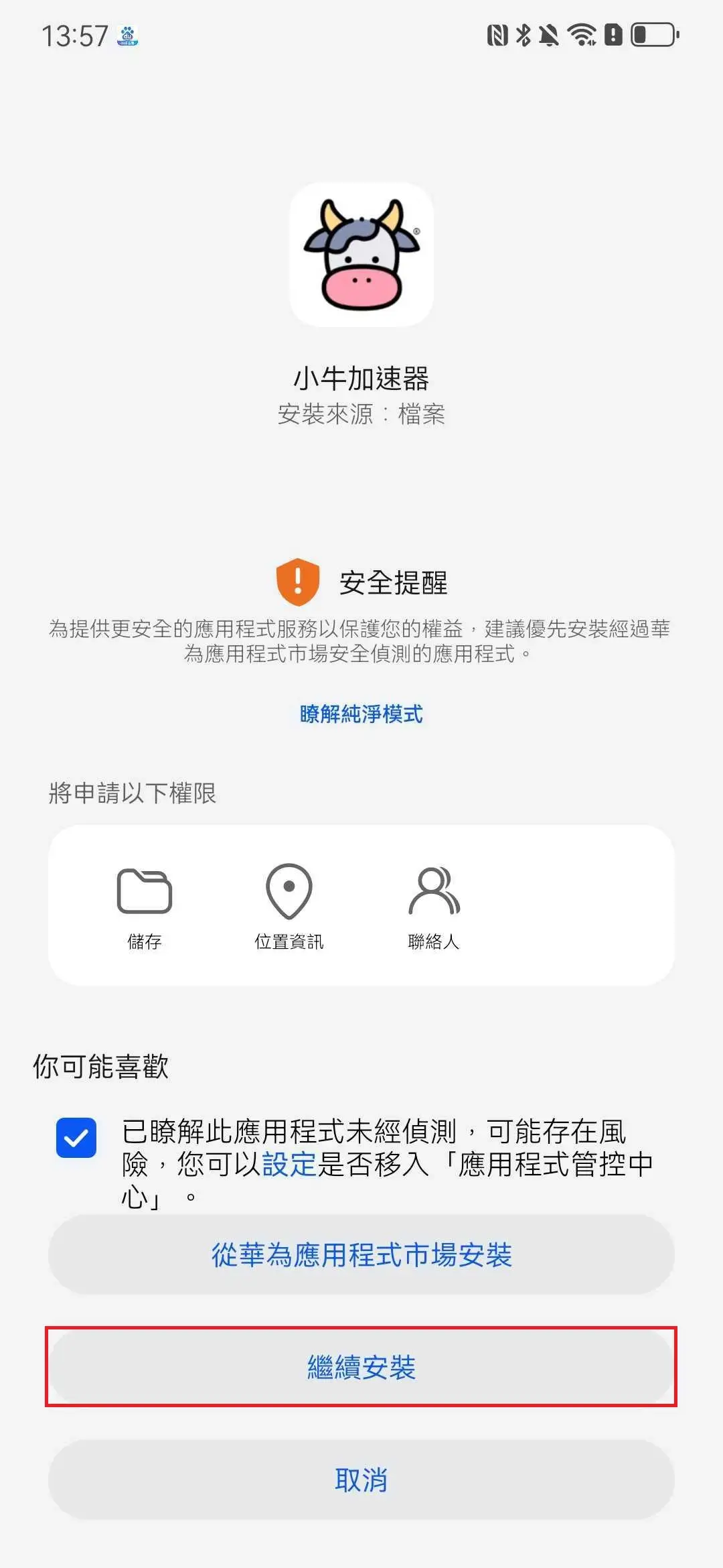 安裝時若遇到安全提醒,沒有「安裝」按鈕,請先點擊「取消」。